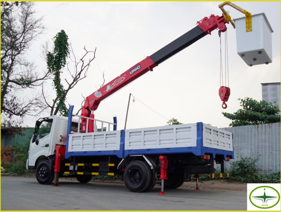 Ghi chú: Cần cẩu thủy lực nhãn hiệu UNIC model URV346 có sức nâng lớn nhất/tầm với theo thiết kế là 3030 kg/2,4 m và 130 kg/14,42 m và rổ nâng người làm việc trên cao
